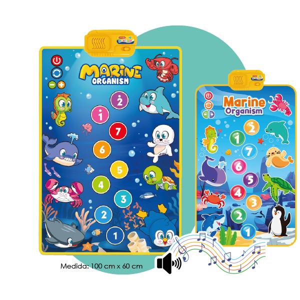 Alfombra de juego musical azul, temática marina, con divertidos personajes, ideal para despertar la creatividad y curiosidad.