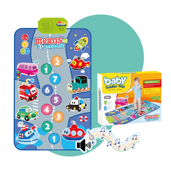 Alfombra musical colorida con transporte; ideal para aprender jugando. Fomenta habilidades motoras, diseño duradero.