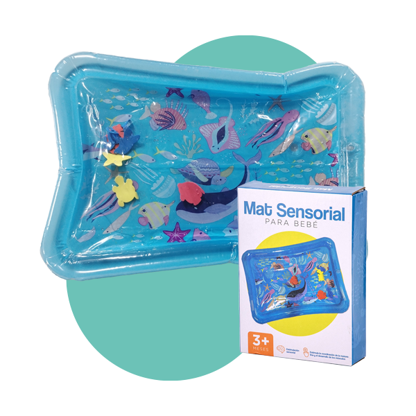 Alfombra sensorial acuática azul con diseños marinos; estimula el desarrollo sensorial desde los tres meses.