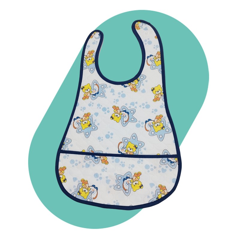 Babero impermeable con diseño de animalitos y borde azul, ideal para mantener limpia la ropa del bebé.