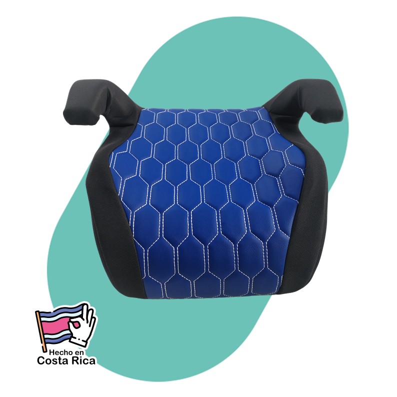 Asiento elevador infantil azul, diseño hexagonal, acolchado, ideal para la seguridad y comodidad en el auto.
