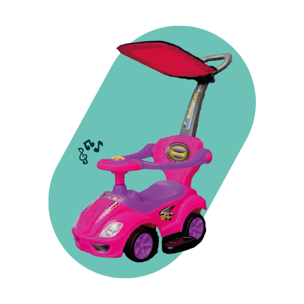 Pequeño coche con sombrilla musical, diseño deportivo, color fucsia, para paseos seguros y divertidos.