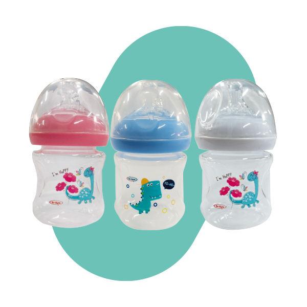 Biberones anticolónicos con divertidos diseños de dinosaurios, en colores rosa, azul y gris. Material seguro y duradero., Chupones