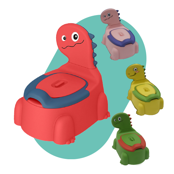 Bacenilla dino roja de plástico durable, diseño divertido para un entrenamiento cómodo y seguro en el sanitario.