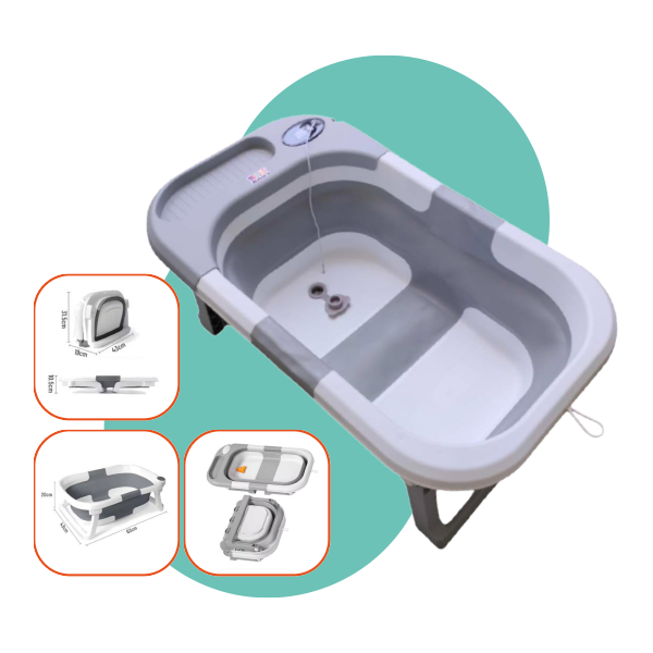 Bañera plegable gris y blanca, diseño compacto y resistente para el confort y seguridad de tu bebé.